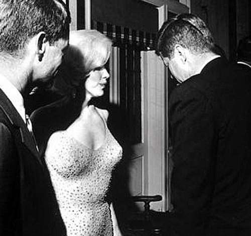1962年5月19日,為慶祝肯尼迪總統(tǒng)即將到來的生日,瑪麗蓮-夢露身穿綴滿亮片的露背晚禮服,在紐約麥迪遜花園廣場獻唱了一首甜蜜的《總統(tǒng)先生,生日快樂》。演唱結(jié)束后,白宮攝影師塞西爾-斯托頓抓拍到一張瑪麗蓮夢露與肯尼迪兄弟的合影。