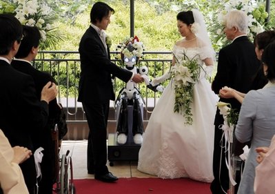 這款高約1.5米的機(jī)器人身體主要是白色,頭戴花環(huán),還有兩根塑料辮子!八钡难劬梢蚤W爍,也可以用她細(xì)細(xì)的嗓音說(shuō)出“你可以揭開(kāi)新娘的面紗了”之類的話語(yǔ),主持起婚禮是有模有樣。