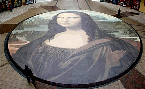 據(jù)英國廣播公司報道,這個全民參與的藝術(shù)作品可謂世界上最大的蒙娜麗莎肖像。該地區(qū)上百名民眾都加入到了這個藝術(shù)項(xiàng)目中來。這幅巨大的乙烯肖像占地面積達(dá)240平方米,是掛在巴黎盧浮宮博物館那幅原作的50倍之大,可以容納22輛倫敦的公共汽車。