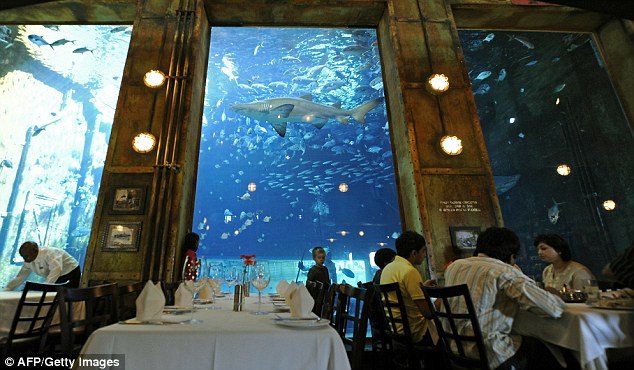 當(dāng)你在船尾這家涼爽昏暗的角落,大嚼著生猛海鮮,這家海洋樂(lè)園著名的鯊魚,會(huì)從你就餐的窗戶外遨游而過(guò)。