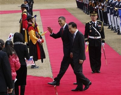 中新網(wǎng)11月19日電 據(jù)路透社報(bào)道,美國總統(tǒng)奧巴馬周四(19日)將在亞洲之行的最后一站會(huì)晤韓國總統(tǒng)李明博,討論將朝鮮拉回六方會(huì)談?wù)勁凶赖膯栴},以及一份被擱置已久的美韓自由貿(mào)易協(xié)定。