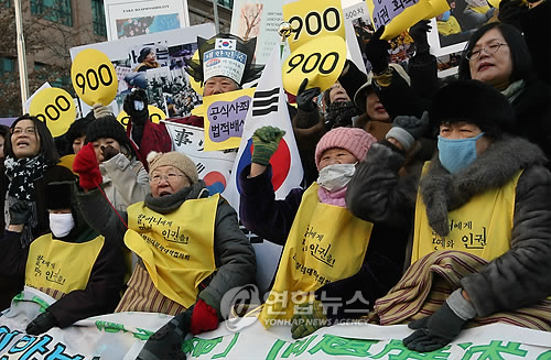 中新網(wǎng)1月13日電 韓國(guó)挺身隊(duì)問題對(duì)策協(xié)會(huì)(以下簡(jiǎn)稱挺身隊(duì)協(xié)議會(huì))13日下午12點(diǎn)在日本駐韓國(guó)大使館前舉行了第900次周三集會(huì)。