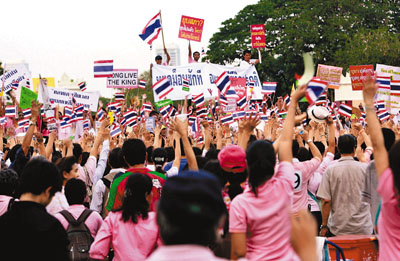 這批“粉衫軍”包括來自曼谷朱拉隆功大學(xué)的師生、旅游業(yè)者和“和平網(wǎng)絡(luò)”組織的成員,有人稱他們?yōu)椤胺奂t運動”。在前副警察總長瓦西和朱拉隆功大學(xué)政治科學(xué)系主任乍叻帶領(lǐng)下,他們昨日在倫披尼公園內(nèi)的拉瑪四世像前宣誓,矢言保護(hù)國家,同時聯(lián)署請愿信,反對解散國會和修改憲法,指此舉不符合國家最佳利益。