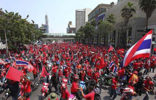 紅衫軍在旅游熱點(diǎn)四面佛附近架起講臺集會,他們站滿馬路、天橋和百貨公司前的廣場,領(lǐng)袖揚(yáng)言徹夜示威,直至重新大選。