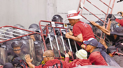 昨日早上9時(shí),約1萬(wàn)名紅衫軍在5星級(jí)酒店四季酒店前面的Rajdamri路集會(huì),警方出動(dòng)5部運(yùn)送囚犯的警車(chē)堵塞路面,阻止他們離開(kāi)曼谷拉差巴頌路的交叉路口,部分紅衫軍企圖沖破約1000名軍警組成的防線,雙方爆發(fā)沖突,互相推撞,示威者又向防暴警察投擲雞蛋和膠瓶,最終成功沖破軍警封鎖直闖“禁區(qū)”。