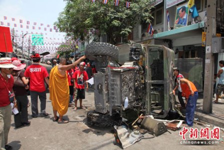 晨光漸現(xiàn),沖突現(xiàn)場(chǎng)遍地防暴盾牌、彈殼、石塊和血泊漸漸顯現(xiàn)出來(lái)!凹t衫軍”重返他們盤(pán)踞的市區(qū),向大家展示著他們從軍隊(duì)那兒搶來(lái)的武器,包括步槍和大口徑機(jī)槍子彈。超過(guò)6輛軍車(chē)、裝甲運(yùn)兵車(chē)等遭抗議者破壞!凹t衫軍”領(lǐng)袖之一乍都蓬說(shuō),阿披實(shí)的雙手已因沖突而“沾滿(mǎn)鮮血”。他在一個(gè)演講臺(tái)上說(shuō):“‘紅衫軍’是永遠(yuǎn)都不會(huì)與‘劊子手’談判的”。他認(rèn)為,“雖然路途崎嶇,又充滿(mǎn)障礙,但把民主帶到這個(gè)國(guó)家,從而為死者增光,是我們的責(zé)任!