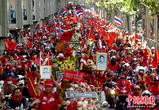 12日早上,紅衫軍在曼谷市區(qū)抬著11個棺材舉行游行,稱里面放著死于10日暴力沖突的喪生者遺體,借此向政府施壓,要求阿披實下臺。