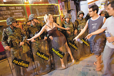 泰國軍警日前全副武裝進駐金融區(qū)進行布防。軍方警告,如果反政府紅衫軍闖入“曼谷華爾街”,當局會毫不猶豫采用武力驅散示威者后,并允許士兵在自衛(wèi)時發(fā)射實彈。