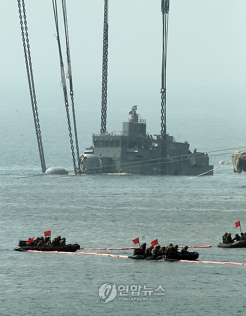 中新網(wǎng)4月23日電 據(jù)韓聯(lián)社報(bào)道,韓國(guó)軍方和打撈公司從當(dāng)?shù)貢r(shí)間23日上午8點(diǎn)49分起,開(kāi)始把“天安”艦船頭扶正。未過(guò)多時(shí),往右邊傾斜的船頭漸漸浮出水面,露出寫(xiě)著“天安”艦識(shí)別編號(hào)“772”的部位和艦橋。