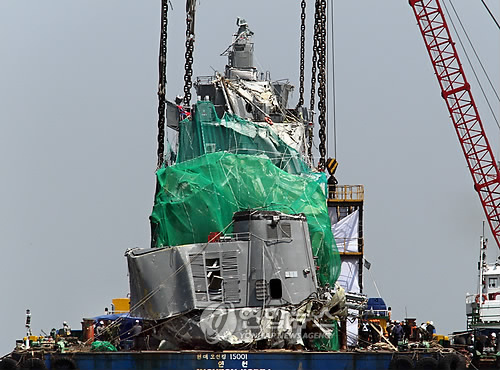 被吊至駁船上,在進(jìn)行固定之后,韓國海難救援隊(SSU)將進(jìn)入艦艇內(nèi),進(jìn)行遺體找尋工作。與此同時,軍民聯(lián)合組成的調(diào)查團(tuán)將開展事故原因的調(diào)查工作。