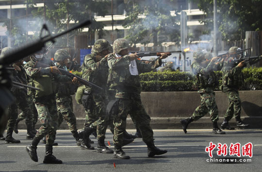 美聯(lián)社在報道中表示,泰國軍隊向示威人群開槍、發(fā)射催淚彈,并向紅衫軍集會地點推進。