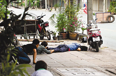 在示威區(qū),有居民自設(shè)圍欄,以免紅衫軍逃走時闖進。部分居民更急急收拾細軟離開。46歲的拉達與女兒拖著行李離開時說:“他們關(guān)掉所有燈,我們已沒有食物……過去兩晚最危險,所以要離開!