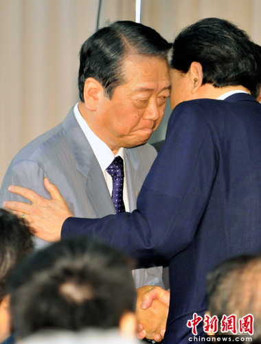 鳩山由紀(jì)夫眼中噙淚,在民主黨集會(huì)現(xiàn)場(chǎng)稱,他和干事長(zhǎng)小澤一郎均將辭職。