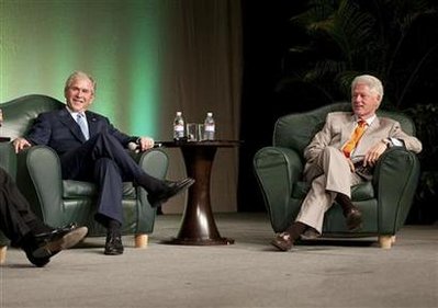 克林頓卸任后,多次與布什的父親、即前總統(tǒng)老布什合作,例如替南亞海嘯及超級颶風“卡特里娜”天災的災民籌款,兩人有一段時間經常走在一起。布什開玩笑道,不知道自己的父親花了多少時間與克林頓同場亮相。