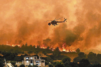 大火周五晚在雅典東北部40公里的格蘭瑪?shù)峡拼迩f燒起,隨即蔓延到附近的住宅區(qū)。