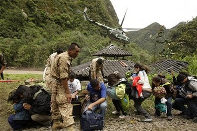 秘魯官員稱(chēng),如果天氣情況允許,當(dāng)局將在當(dāng)?shù)貢r(shí)間今天早上6點(diǎn)開(kāi)始對(duì)仍然滯留的800名游客展開(kāi)新一輪的援救疏散計(jì)劃。此外,秘魯政府還為當(dāng)?shù)乇缓樗、山體滑坡以及暴漲的河水圍困的約8000名當(dāng)?shù)鼐用裉峁┝耸澄铩?/p>