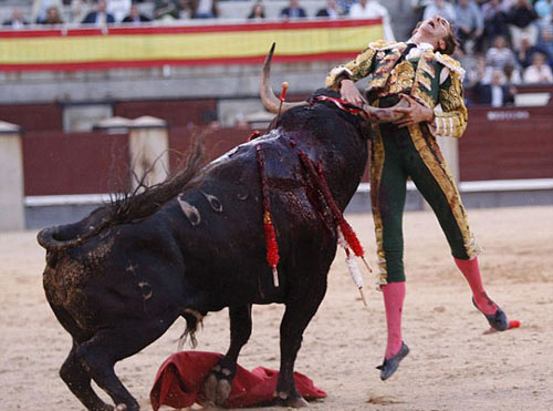 西班牙斗牛士Israel Lancho的肚子被公牛的尖角扎出一道長(zhǎng)達(dá)8英寸(約20公分)的口子,西班牙的媒體都驚呼,牛角沒(méi)有扎中心臟簡(jiǎn)直就是奇跡!