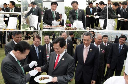 在蒙蒙細(xì)雨中東盟領(lǐng)導(dǎo)人手舉雨傘進(jìn)入了午宴會(huì)場,而李明博戴著手套、身穿圍裙在炭爐前親自烤肉,吸引了各國領(lǐng)導(dǎo)人的目光。