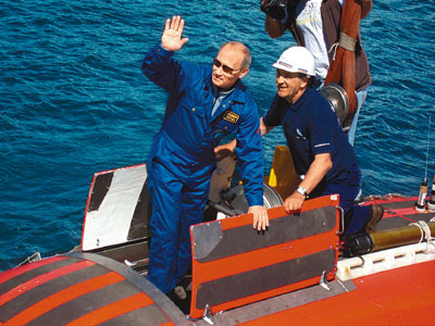 根據(jù)國營電視臺發(fā)出的照片,可見身為柔道黑帶高手的普京身穿藍色工作服,攀上Mir-1潛艇開始航程。普京在船艙表示:“這次潛水很順利,視野在燈光下很好。”但他對水顯得污濁有微言:“從生態(tài)角度看這些水當然干凈,但事實上這是浮游生物湯,起碼我是這樣叫它!