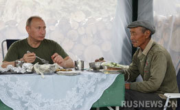 普京參觀了牧羊人簡樸的住處。熱情好客的牧羊人介紹普京與自己的兩個女兒認識。雖然牧羊人俄語講的很不好,他主要講圖瓦語,但是他和普京還是找到了共同語言。普京把自己戴的手表摘下來送給牧羊人的兒子作為紀念,他還把自己的獵刀贈給熱情好客的牧羊人。