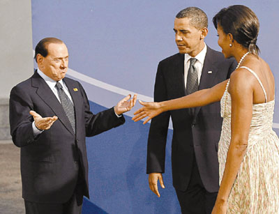 據(jù)香港《文匯報(bào)》報(bào)道,晚宴上,奧巴馬夫婦以東道主身份負(fù)責(zé)迎賓,被意大利媒體稱為“性上癮”的老貝見(jiàn)到美國(guó)第一夫人米歇爾時(shí)顯得相當(dāng)高興,伸出雙臂示意互相擁抱。誰(shuí)知米歇爾遠(yuǎn)遠(yuǎn)伸出一只手,示意握手打招呼,令場(chǎng)面顯得很尷尬。更值得注意的是,站在一旁的奧巴馬一臉冷漠,斜睨老貝,顯得十分警惕。
