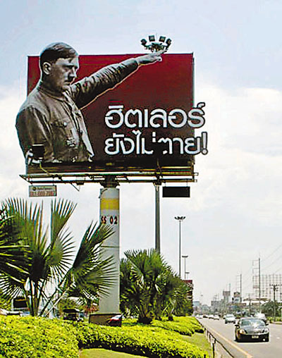 據(jù)悉,希特勒廣告牌于兩周前豎起,是為當(dāng)?shù)芈芬讏D索蠟像館下月開(kāi)張做的宣傳。該廣告牌位于進(jìn)入芭堤雅的主要高速路旁,希特勒的畫(huà)像與廣告牌上的泰文廣告語(yǔ)“希特勒未死“十分醒目。廣告牌豎起以來(lái),泰國(guó)方面已經(jīng)接到100多宗投訴和德國(guó)、以色列等國(guó)大使館的抗議信。