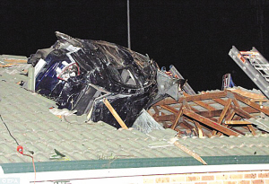 19日凌晨,尚在睡夢中的阿諾德夫婦突然被一聲巨響驚醒,他們感到自己家的平房似乎在震動,于是立即抱著僅有3個月大的女兒沖出了室外。他們被眼前的一幕驚呆了:一輛汽車砸爛了他們家的屋頂,而且一半車身已經(jīng)陷了進去。如果汽車掉進他們家臥室的話,后果將不堪設想。