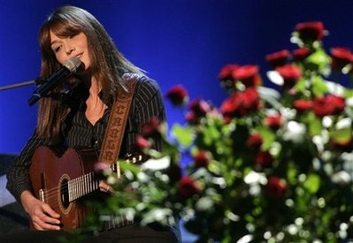法國(guó)總統(tǒng)薩科齊的夫人卡拉·布呂尼在德國(guó)紐倫堡一電視節(jié)目中演唱她的新歌。