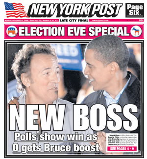 據(jù)美國(guó)《紐約郵報(bào)》3日?qǐng)?bào)道,美國(guó)當(dāng)?shù)貢r(shí)間11月2日,奧巴馬一家在俄亥俄州克利夫蘭的競(jìng)選集會(huì)上與著名美國(guó)搖滾歌手布魯斯斯普林斯廷同臺(tái)獻(xiàn)藝。新一輪民調(diào)顯示,離大選還有最后一天,奧巴馬已經(jīng)贏了。該報(bào)封面用“新老板”來(lái)稱(chēng)呼勝利在望的奧巴馬。該報(bào)稱(chēng):斯普林斯廷用歌聲表達(dá)了對(duì)奧巴馬的贊揚(yáng)。據(jù)悉,1984年大選中,獲勝的里根曾引用斯普林斯廷的歌詞以爭(zhēng)取年輕人的選票。