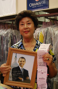 之前的30多年里,這家洗衣店是由另外一位韓國(guó)人經(jīng)營(yíng),姜女士是在去年剛接手過(guò)來(lái)的。她表示:“聽(tīng)之前的店主人說(shuō)‘奧巴馬1992年和妻子米歇爾結(jié)婚后就成了我們店的常客’。即使在競(jìng)選期間,他每周也送洗兩次衣服!闭f(shuō)著,她還展示了奧巴馬的照片和他開(kāi)出的回執(zhí)。
