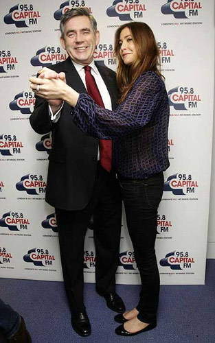 據(jù)英國(guó)媒體披露,11日首相布朗應(yīng)邀參加總部設(shè)在倫敦的“全球廣播電臺(tái)”的開(kāi)業(yè)典禮,擔(dān)當(dāng)剪彩嘉賓。英國(guó)著名女主播麗莎·史諾頓也在受邀之列。剪彩后鑒于主持人的要求,兩人在偌大的舞廳里翩翩起舞。布朗精湛的舞技贏得美女名模兼主播的稱贊和掌聲。