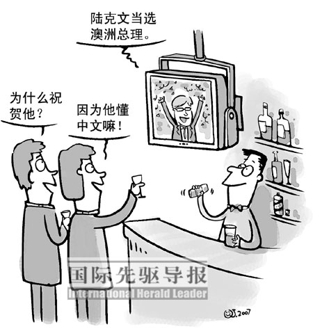 11月24日,澳大利亞聯(lián)邦大選,工黨勝出,50歲的陸克文成為澳大利亞新總理。有人說,陸克文是澳大利亞的布萊爾。這兩位政治明星都充滿活力、富有親和力、相貌俊朗,而且同為工黨領(lǐng)袖,除了陸克文能講一口流利的漢語(yǔ)之外,其他相似之極。