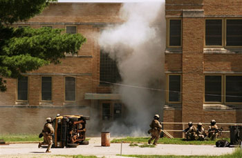 最具真實感和危險性的體驗場景,是清除一座建筑內(nèi)的潛在威脅。海軍陸戰(zhàn)隊員越過前院燃火的鐵絲網(wǎng),冒著手榴彈爆炸的巨大聲響,進(jìn)入建筑展開全方位地毯式搜查行動,直至確定消除所有具有攻擊能力的敵人,救出全部幸存者。