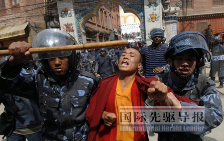 次仁們算是幸運的!秶H先驅(qū)導報》記者在現(xiàn)場看到,被煽動沖在前面和尼泊爾警方對峙、沖突的多是青少年,而那些“藏獨”骨干則在現(xiàn)場附近拿著手機指揮、清點人頭。