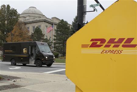 11月11日,美國(guó)維明頓,一輛UPS運(yùn)送車駛過一個(gè)DHL投遞箱。