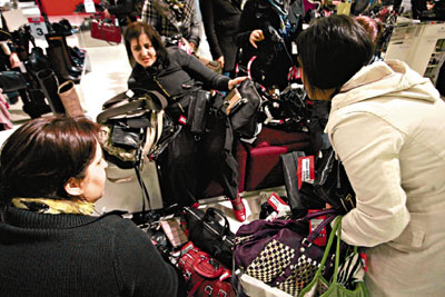 在伯明翰一購物中心,3位顧客在爭(zhēng)奪減價(jià)名牌手袋。