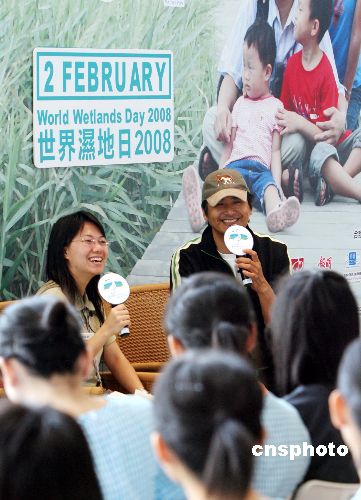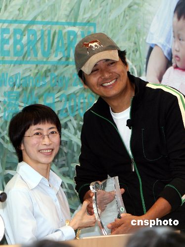 十月二十日,國際影視巨星周潤發(fā)在香港濕地公園舉行的世界濕地日2008香港區(qū)慶;顒訂觾x式上,獲頒濕地保育大使委任狀。中新社發(fā) 武仲林 攝