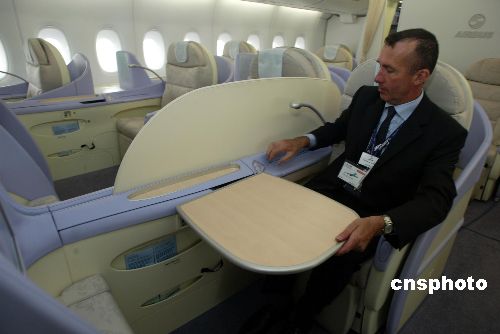 10月26日,參觀空中客車(chē)A380飛機(jī)的北京民眾被其豪華舒適的客艙所吸引。當(dāng)日,一架生產(chǎn)編號(hào)為007的空中客車(chē)A380客機(jī)停靠在北京首都國(guó)際機(jī)場(chǎng)N104機(jī)位,接待北京媒體及部分嘉賓的參觀。此次A380中國(guó)大陸之行為期一周,包括廣州、上海及北京三個(gè)城市,這是A380飛機(jī)2007年環(huán)球飛行之旅的重要部分。中新社發(fā) 楊影懿 攝
