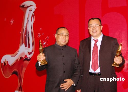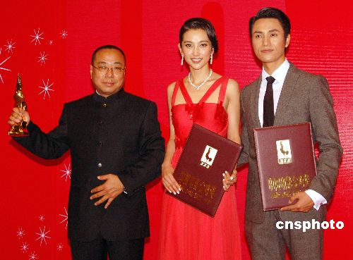 ,《云水瑤》以八項提名成為大熱門,最終繼獲“華表獎”之后再獲金雞獎最佳影片獎。圖為導(dǎo)演尹力與主演李冰冰、陳坤登臺領(lǐng)獎。