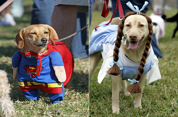 圖片十二:在美國加州長(zhǎng)灘舉行的萬圣節(jié)服裝游行上,一種短腿長(zhǎng)身的德國種獵犬芭比裝扮成超人的模樣;右圖中這個(gè)小狗的造型你熟悉么?它是來自新奧爾良的洛克西,它扮演的就是《綠野仙蹤》中的小女孩多羅茜。(鐘巖)