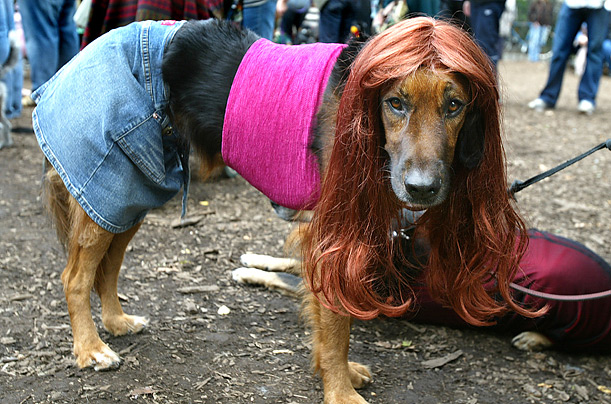 圖片十三:在紐約城湯普金斯廣場公園舉行的萬圣節(jié)小狗大游行中,大狗羅西頭戴金紅色長發(fā),上身穿著迷你裹胸,下身著迷你牛仔裙,打扮成一個性感少女的模樣,吸引了眾多的目光。(鐘巖)