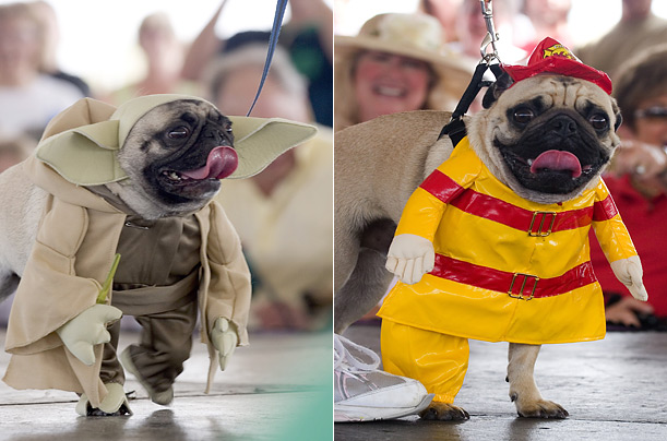 圖片十五:在弗洛里達(dá)州布蘭登通的年度哈巴狗大賽上,左圖中的“時(shí)尚人士”尤達(dá)正與右圖中的“消防員”爭(zhēng)奪第一名。(鐘巖)