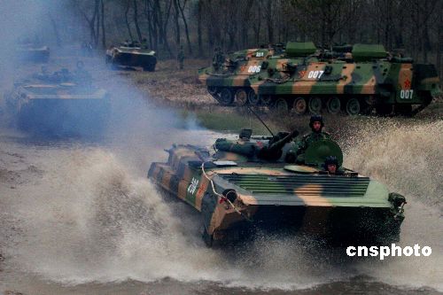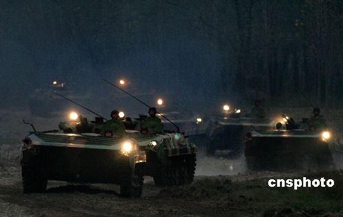 10月底,“鐵拳-2007”復(fù)雜電磁環(huán)境下機(jī)步師實(shí)兵檢驗性演習(xí)完成電磁對抗,進(jìn)入實(shí)兵交戰(zhàn)階段。圖為裝甲部隊向演習(xí)地域集結(jié)。中新社發(fā) 曾憲平 攝