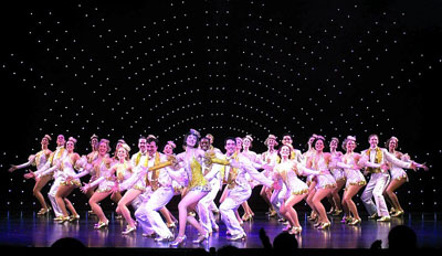 《42街》精妙絕倫的踢踏舞是觀眾最值得期待的表演。不同于傳統(tǒng)愛爾蘭踢踏舞的嚴(yán)肅、西班牙佛朗朗哥古典芭蕾的優(yōu)柔和現(xiàn)代舞的活力與動(dòng)感,《42街》以輕盈、歡快的美國踢踏舞為主,每一幕都可以看到眾多舞姿精湛的踢踏舞演員和著節(jié)拍輕踏雙腳。在節(jié)奏強(qiáng)勁的音樂聲中,上百只鮮艷的舞鞋在木地板上咔咔作響,聲勢浩大,規(guī)模空前。