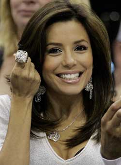 “絕望主婦”伊娃·朗格莉亞日前助陣丈夫托尼·帕克所屬馬刺隊(duì)和開拓者隊(duì)的NBA常規(guī)賽。場邊的她除了為老公充當(dāng)拉拉隊(duì)外,還不時拿起托尼碩大的2007NBA總冠軍指環(huán),朝著媒體鏡頭得意地大秀一番。