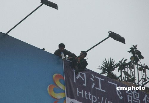 11月11日上午,在四川省內(nèi)江市東興區(qū)西林大橋橋頭一七層高樓外的廣告牌上,一青年男子利用手中擴音喇叭高喊“因工作失意,欲一死了之”,很快吸引了數(shù)百名群眾。趕到現(xiàn)場的派出所民警和消防戰(zhàn)士將其成功解救。