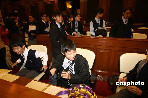 圖為同學(xué)們?cè)谧h員的座位上體驗(yàn)當(dāng)議員的感覺。