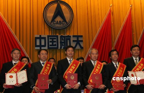 中華全國總工會(huì)決定頒發(fā)該集團(tuán)一批為首次月球探測(cè)工程做出貢獻(xiàn)的集體和個(gè)人“全國五一勞動(dòng)獎(jiǎng)狀”、“全國五一勞動(dòng)獎(jiǎng)?wù)隆保袊\(yùn)載火箭技術(shù)研究院“長(zhǎng)征三號(hào)甲”系列運(yùn)載火箭總指揮岑拯(左三)等獲得“全國五一勞動(dòng)獎(jiǎng)?wù)隆薄?/div>