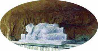 鐘祖洞:鐘離權(quán),又稱漢鐘離,坦胸露腹,大眼睛,紅臉面,頭上扎著兩個(gè)丫髻.他為漢時(shí)將軍,兵敗后逃至山谷,遇東華先生傳他金丹火候,金科靈火,又往崆峒山訪道。太上老君身騎青牛,手執(zhí)寶扇,立于面前曰:“普濟(jì)渡世,綿山養(yǎng)功!辩婋x來到這里,見紫氣繚繞,故在此洞中修行,終于練成八段錦道功。后又往返于崆峒山、綿山兩地,普濟(jì)眾生。八段道功集治病養(yǎng)生為一體。