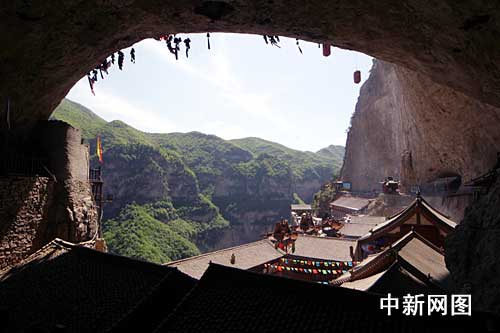 抱腹巖為綿山百余處巖洞之首,因形如兩手抱腹,所以又叫抱腹巖。抱腹巖之腹大,大得驚人:抱二百余間殿宇禪房及一兩萬名游人于腹內(nèi)而不顯得擁擠?箲(zhàn)時(shí)期,介休抗日民主政府常在這里召開全縣軍民大會(huì),部署生產(chǎn)和戰(zhàn)斗任務(wù)。抱腹巖是天然生成的超大型禮堂.抱腹巖坐東面西,為一高約18丈,長約45丈,深約15丈的巨形巖洞。巖洞分上下兩層,上層是兩個(gè)直角排列的大巖洞,很象磚圈的“無量殿”,路斷處有木棧道溝通,自下仰望殿宇參差,勾欄蜿蜒,猶如空中樓閣.更引人注目的是巖洞頂壁的無數(shù)個(gè)鳥洞和懸掛著的銅鈴。抱腹巖掛鈴為綿山一絕,每逢廟會(huì),許了愿的善男信女們便雇人從巖頂將掛鈴者用繩子吊在半空,然后利用前后晃動(dòng)的力量將人悠進(jìn)洞內(nèi),用鐵鉤鉤住頂壁打楔系鈴。操作完畢后再用繩子把掛鈴者放到巖下。場(chǎng)面驚心動(dòng)魄,令人嘆為觀止。清代康熙年間介休文人王清在《抱腹巖》一詩中寫道:“寺古云常在,巖空勢(shì)欲傾。此中真得地,以外縱浮名。鳥拂金鈴渡,僧緣石隙行。坐聽梵響處,花雨落無聲”,可謂繪聲繪色的抱腹巖寫照.其中“鳥拂金鈴渡,僧緣石隙行”更成為人們廣泛傳頌的名句。很久以前,綿山中生活著一種叫吻的野獸,非常兇猛,常常傷害過往行人.附近的村民靠山吃山,以采藥為生,而野獸封山,村民們無不頭痛萬分/于是推薦了一個(gè)身體強(qiáng)健,狩獵本領(lǐng)很強(qiáng)的年輕人前去降吻。這個(gè)年輕人想只憑自己的力量那太微不足道了,如果能得到神靈的保佑,一定會(huì)萬無一失。于是他就去求空王佛保佑,祈求老人家賜給自己一件法寶,以降服吻獸.年輕人祈禱完畢,正要走時(shí),忽然看見供案上金光閃閃,霎時(shí)滿殿生輝。走近一看,原來是只銅鈴,銅鈴上還有一道經(jīng)文。這時(shí)殿內(nèi)突然有個(gè)縹緲的聲音:“念此咒,便可降住怪獸,快快去吧.”年輕人這才恍然大悟,慌忙叩拜點(diǎn)化之恩.后來果然降服了吻,人們?yōu)榱烁兄x空王佛的慈悲之心,就把這個(gè)銅鈴掛在抱腹巖的巖頂上,讓它為人們消災(zāi)免禍.